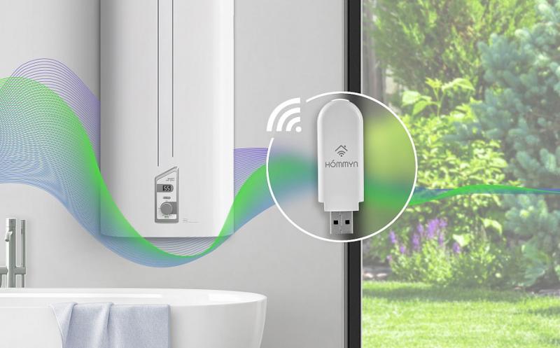 Дистанционное управление не только позволяет контролировать работу прибора, но и помогает экономить ресурсы. Для этого нужно установить специальный съемный Wi-Fi-модуль (приобретается отдельно), подключить его к USB-разъему водонагревателя и скачать на смартфон или другой гаджет мобильное приложение Hommyn.